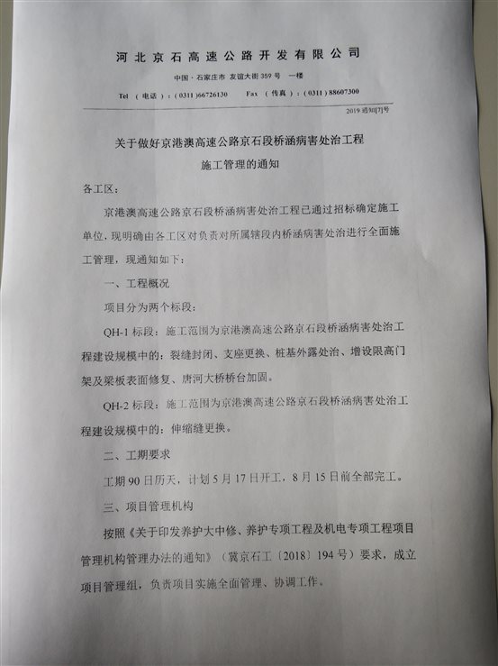 關(guān)于做好京港澳高速公路京石段橋涵病害處治工程施工管理的通知