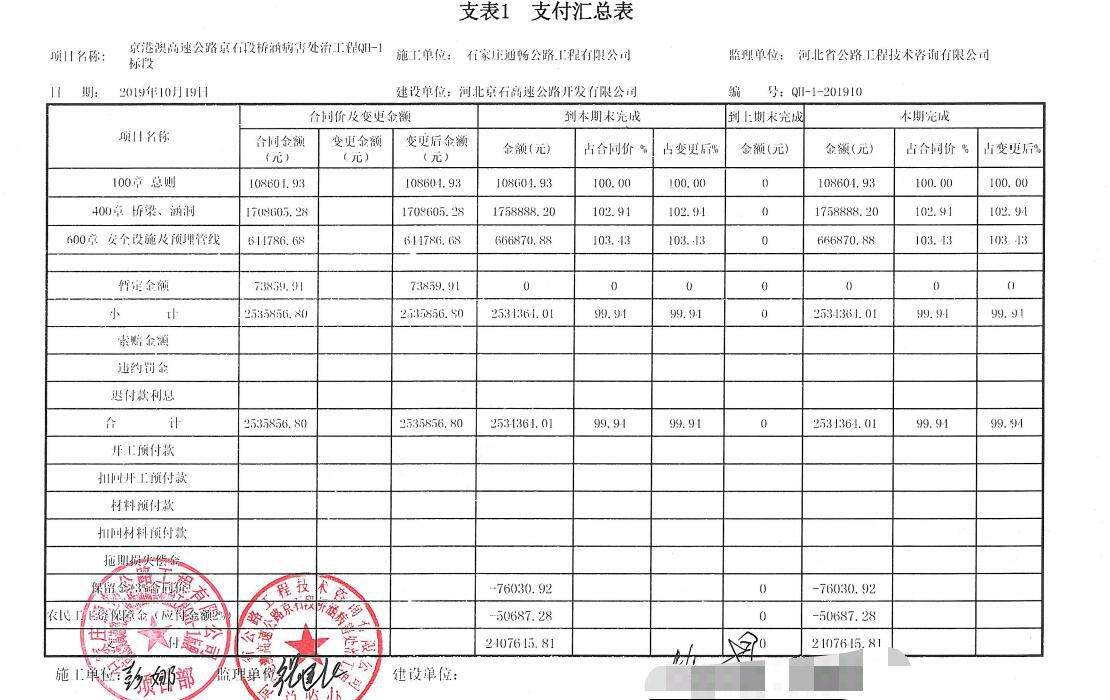 京港澳高速公路京石段橋涵病害處治工程QH-1標(biāo)段工程支付證書