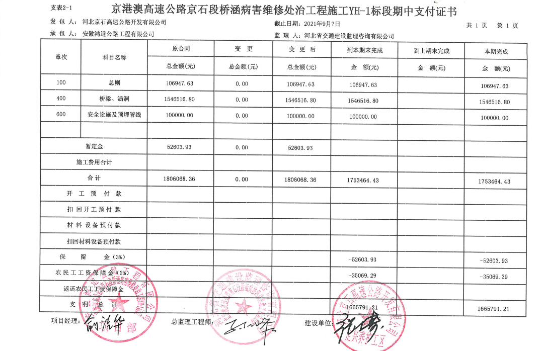 京港澳高速公路京石段橋涵病害維修處治工程YH-1標段支付證書