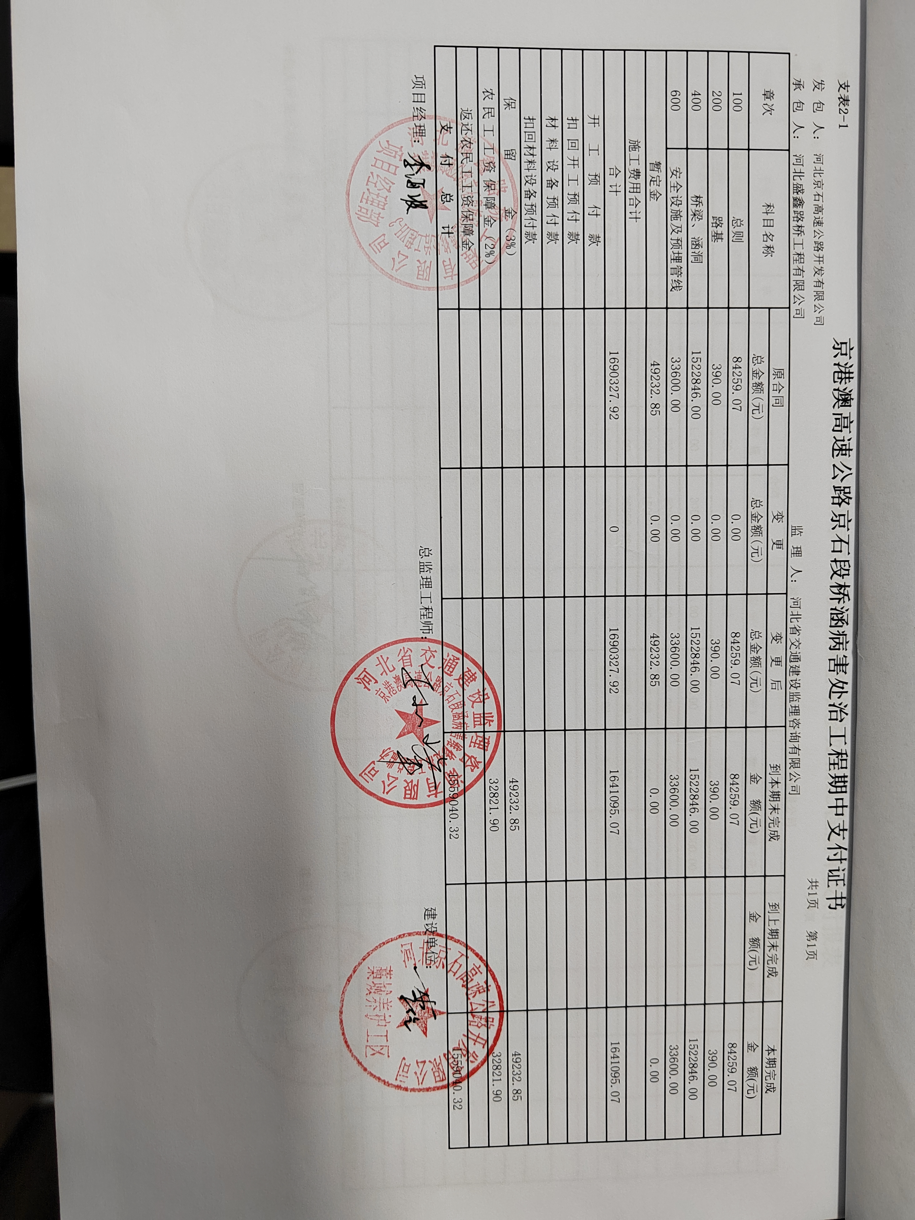 京港澳高速公路京石段橋涵病害維修處治工程YH-3標(biāo)段支付證書(shū)