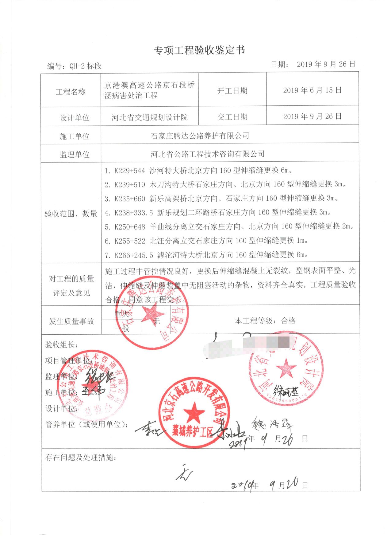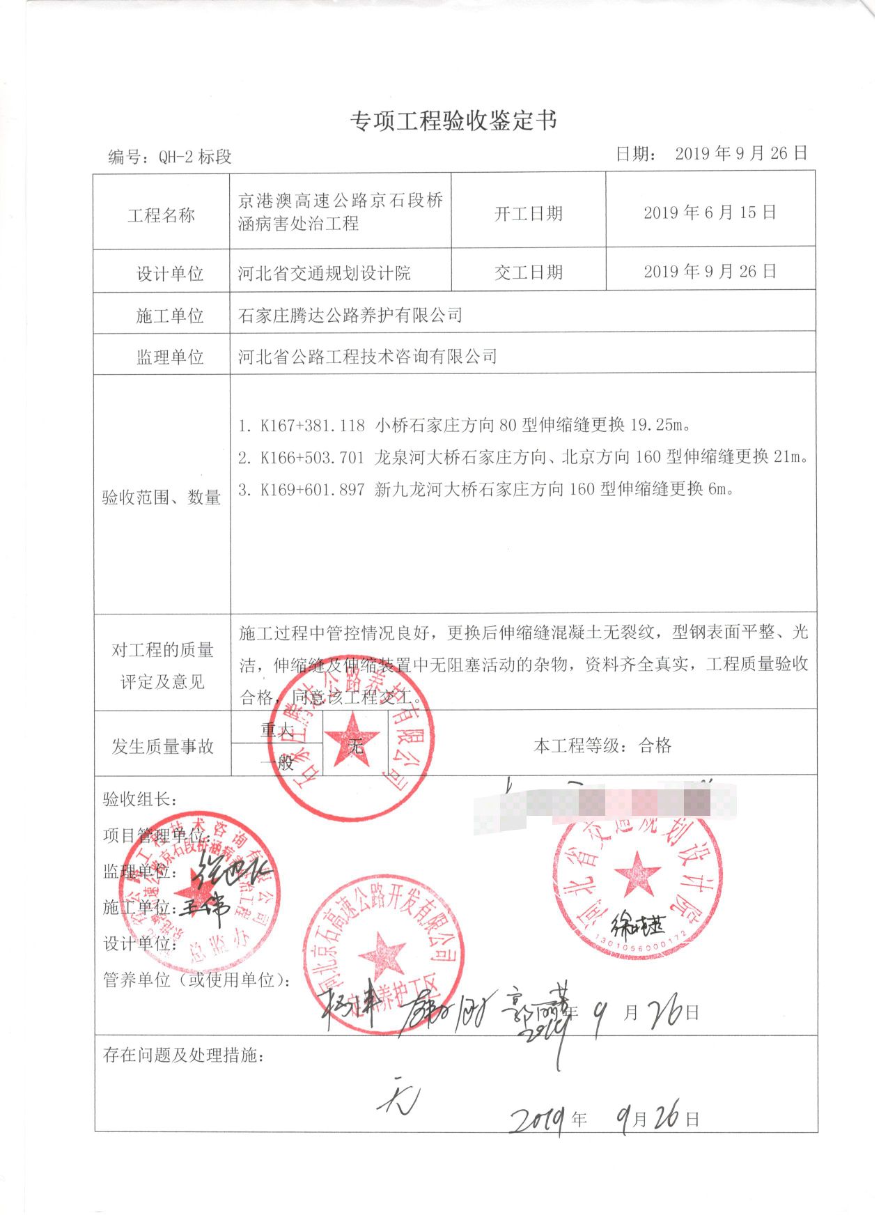 京港澳高速公路京石段橋涵病害處治工程QH-2標(biāo)段工程專項鑒定書