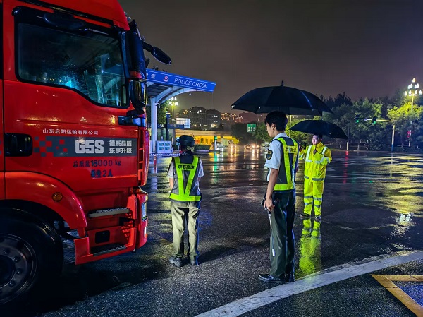 黨員在廣場(chǎng)上忙碌地?cái)[放警示錐,引導(dǎo)車輛有序停靠。暴雨中視線受阻,一輛貨車差點(diǎn)偏離路線,他一個(gè)箭步?jīng)_上前,隔著車窗大聲示意司機(jī)減速,直到車輛安全停穩(wěn),他才松了口氣,后背早已被汗水和雨水浸透?!霸绞沁@種時(shí)候,越得盯緊點(diǎn),綠通車輛耽誤不起,咱們黨員更得頂上去。”他抹了把臉上的雨水。