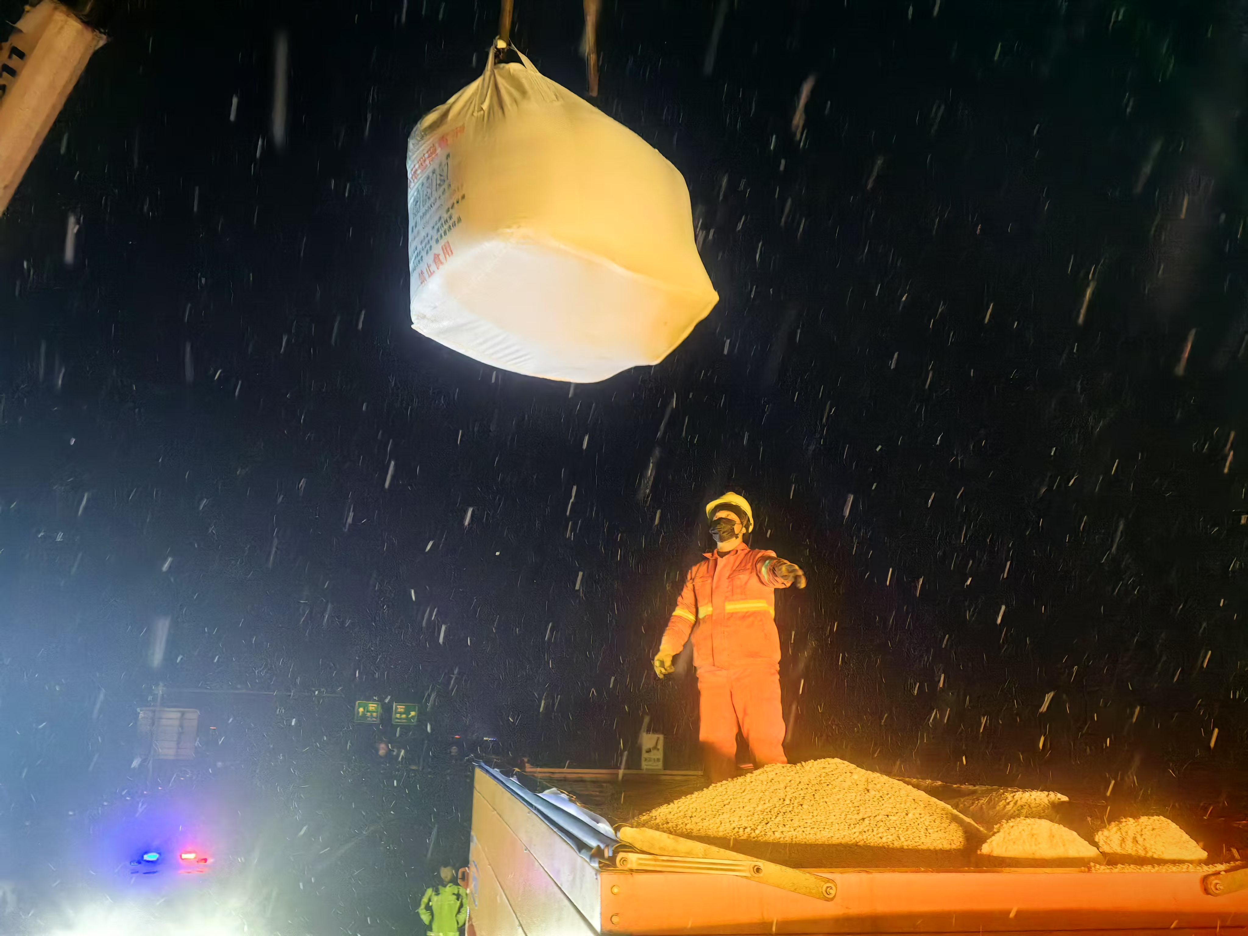 除雪過(guò)程中,養(yǎng)護(hù)人員遵循除雪為主、融雪為輔的原則,采用機(jī)械與人工相結(jié)合方式,完善應(yīng)急處置協(xié)作機(jī)制,在全路段設(shè)置6處融雪劑補(bǔ)給點(diǎn),隨時(shí)為除雪撒布車(chē)補(bǔ)充融雪劑,保證連貫作業(yè),做到科學(xué)、精準(zhǔn)、高效撒布融雪劑。