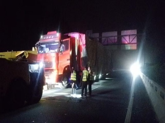 經(jīng)詢問司機(jī)得知,貨車右前輪突然掉落,導(dǎo)致車輛無法移動(dòng)。事發(fā)突然,且處于夜間,大風(fēng)呼嘯,情況十分危險(xiǎn)。定州工區(qū)工作人員立即反應(yīng),第一時(shí)間在貨車后方規(guī)范設(shè)置交通警示標(biāo)志,巡查車開啟導(dǎo)向標(biāo)、高音警報(bào)器,避免過往車輛發(fā)生碰撞事故,引導(dǎo)車上人員轉(zhuǎn)移至護(hù)欄外安全地帶。同時(shí),迅速撥打高速交警與救援電話,通報(bào)現(xiàn)場(chǎng)情況。智調(diào)中心及時(shí)利用可變情報(bào)板對(duì)后方來車予以提醒,避免造成事故。