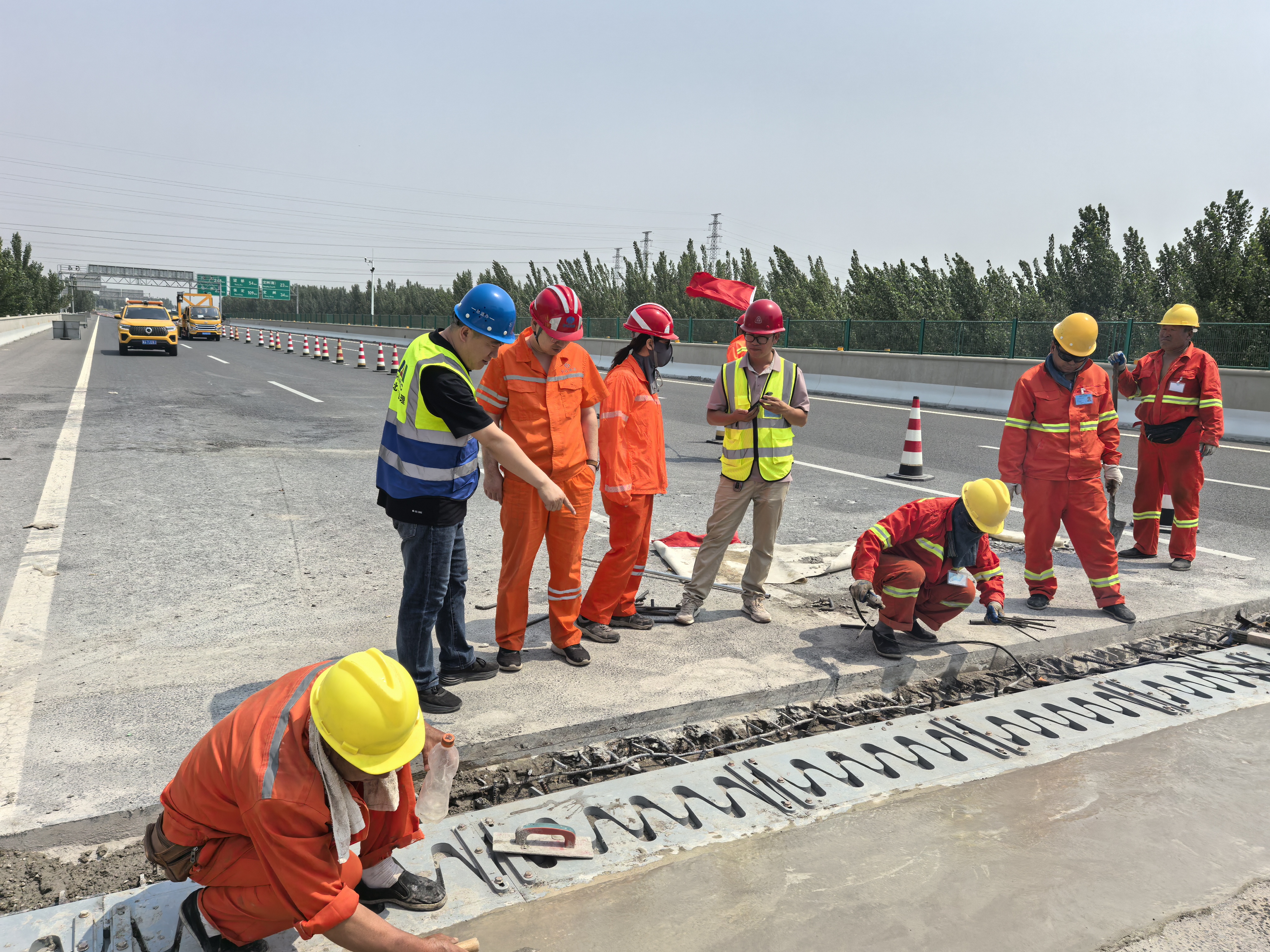 現(xiàn)場監(jiān)理工程師應(yīng)積極履行監(jiān)理職責(zé)做好現(xiàn)場質(zhì)量、安全管控工作,并督促施工單位按已批復(fù)的施工工藝落實現(xiàn)場施工。當(dāng)前正值夏季高溫施工,伸縮裝置兩側(cè)混凝應(yīng)加強(qiáng)養(yǎng)生,確?;炷翉?qiáng)度滿足設(shè)計要求,現(xiàn)場預(yù)埋錨固筋定位準(zhǔn)確、無缺失?,F(xiàn)場施工完畢后施工人員應(yīng)及時清理施工現(xiàn)場,并根據(jù)混凝土試件實測強(qiáng)度結(jié)果和現(xiàn)場施工結(jié)果對比的結(jié)論,經(jīng)經(jīng)監(jiān)理工程、橋梁養(yǎng)護(hù)工程師同意后開放交通。
