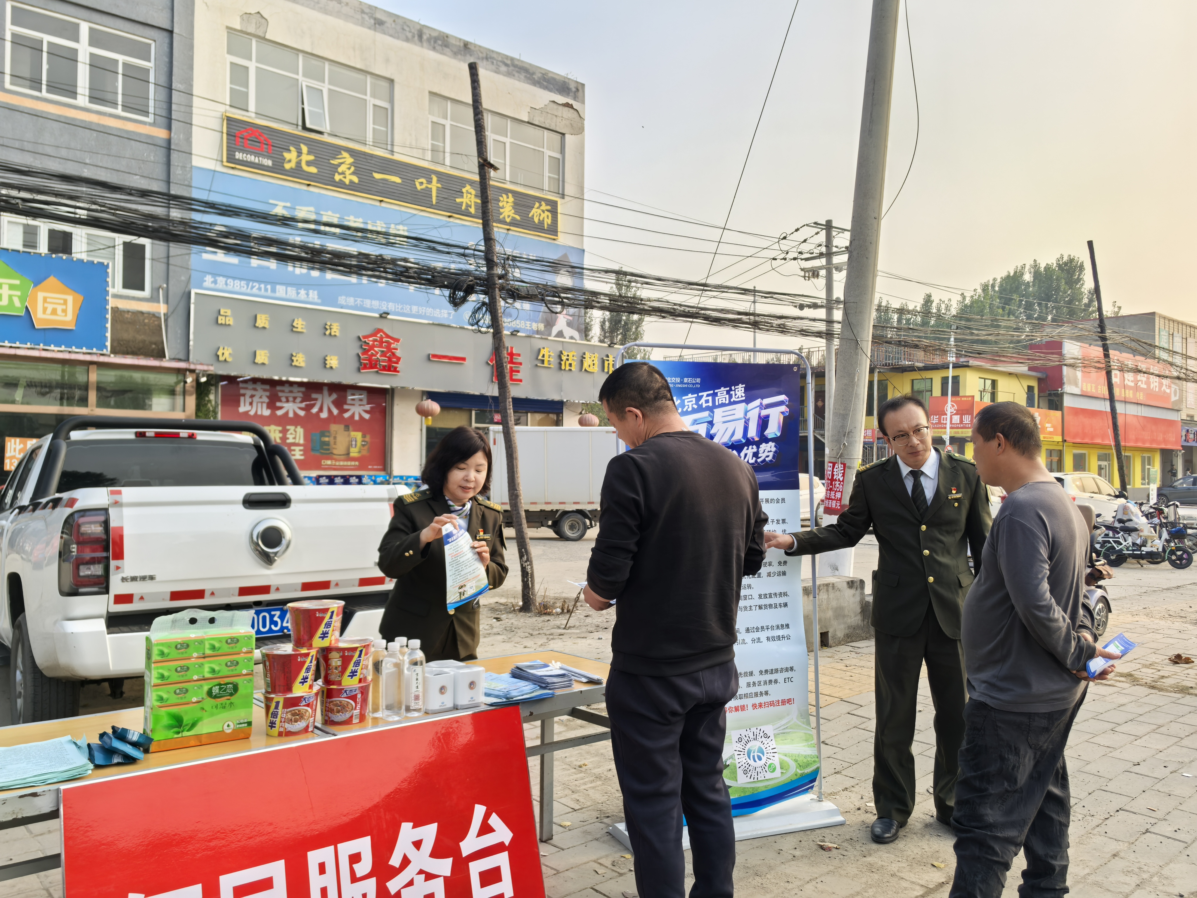 為進一步拓寬車源渠道、深化宣傳京石高速服務惠民力度,10月16日,健康城站結合不同場景特點,分別在固定引流點107國道明元加油站,以及服務社區(qū)居民的臨時引流點挾河社區(qū)公交車站,同步開展特色引流活動,將“京石易行”“冀交萬里行”會員權益、ETC便捷辦理及貨車差異化收費優(yōu)惠等,精準送到不同類型車主手中。