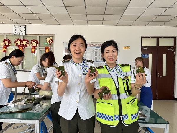 大鍋被這千姿百態(tài)的粽子堆滿了,這份沉甸甸的“滿”,像極了大家心中膨脹的情感,這層層疊疊的粽葉包裹著的是我們對工作順?biāo)斓钠诩?,對司乘平安的祝福、對佳?jié)圓滿的愿望,就讓這粽葉飄香,越過崗?fù)?,守護(hù)每一位司乘,為其保駕護(hù)航。