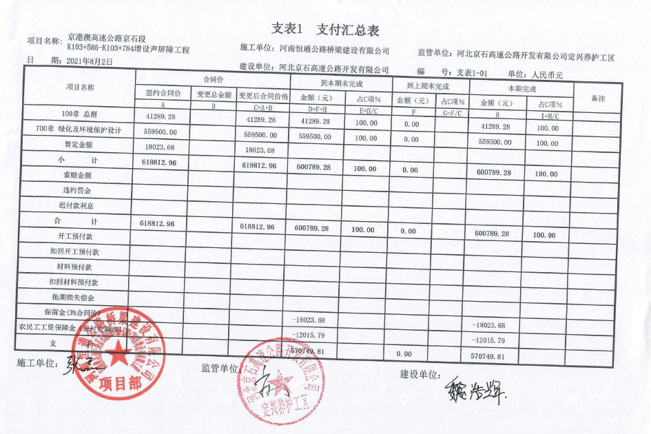 京港澳高速公路京石段K103+586-K103+784段增設聲屏障工程支付證書