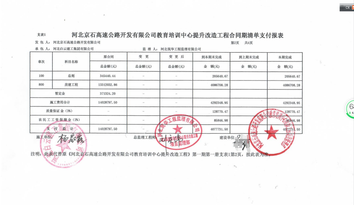 河北京石高速公路開發(fā)有限公司教育培訓(xùn)中心提升改造工程一期支付證書