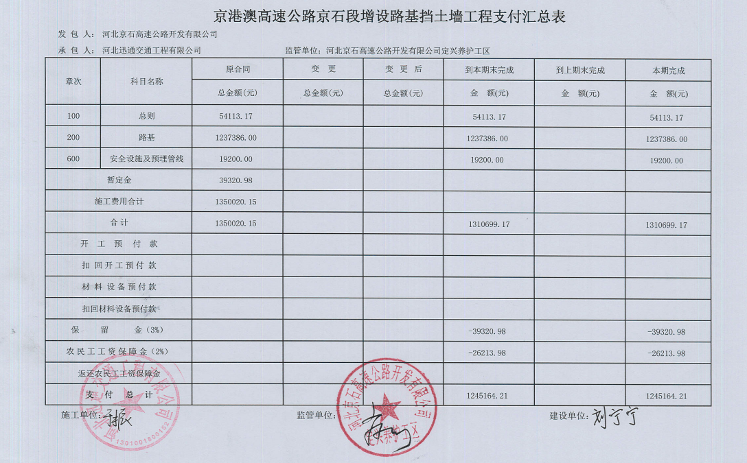 京港澳高速公路京石段增設(shè)路基擋土墻工程施工款