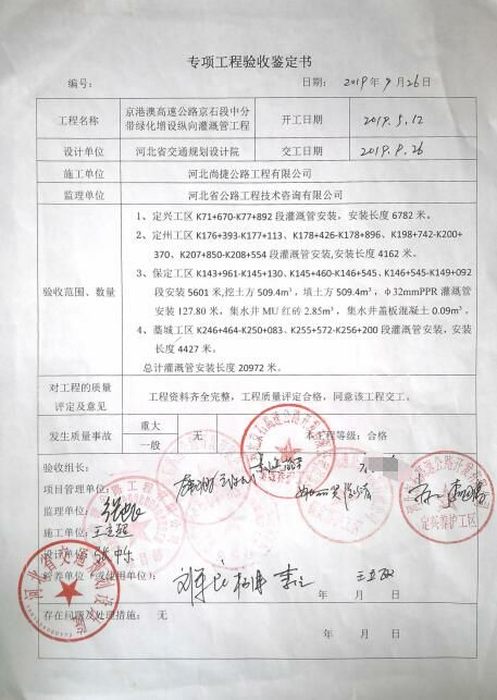 京港澳高速公路京石段中分帶綠化增設縱向灌溉管工程專項鑒定書