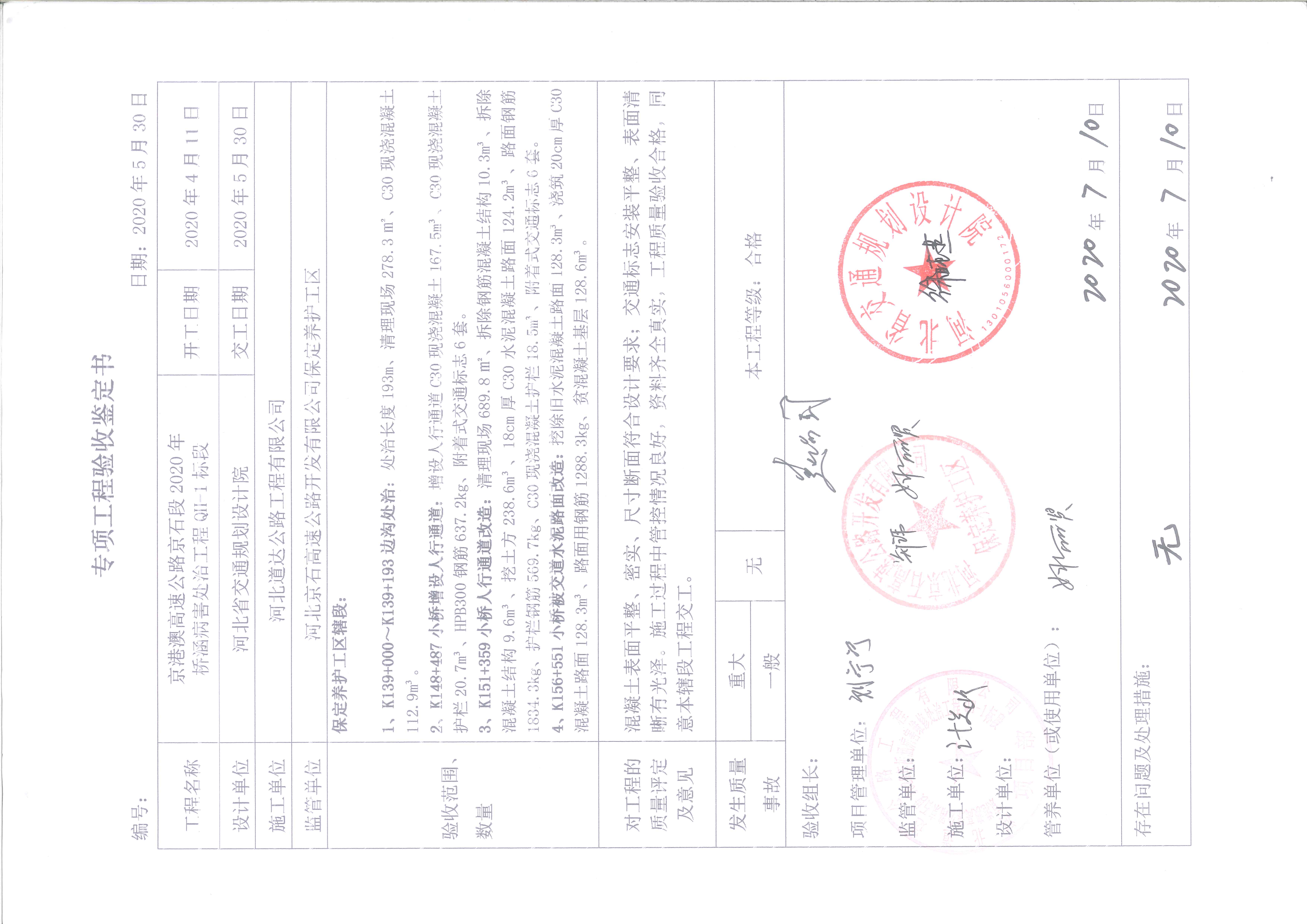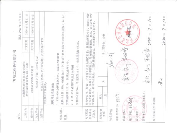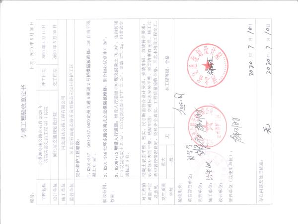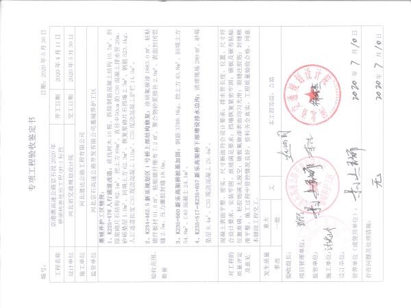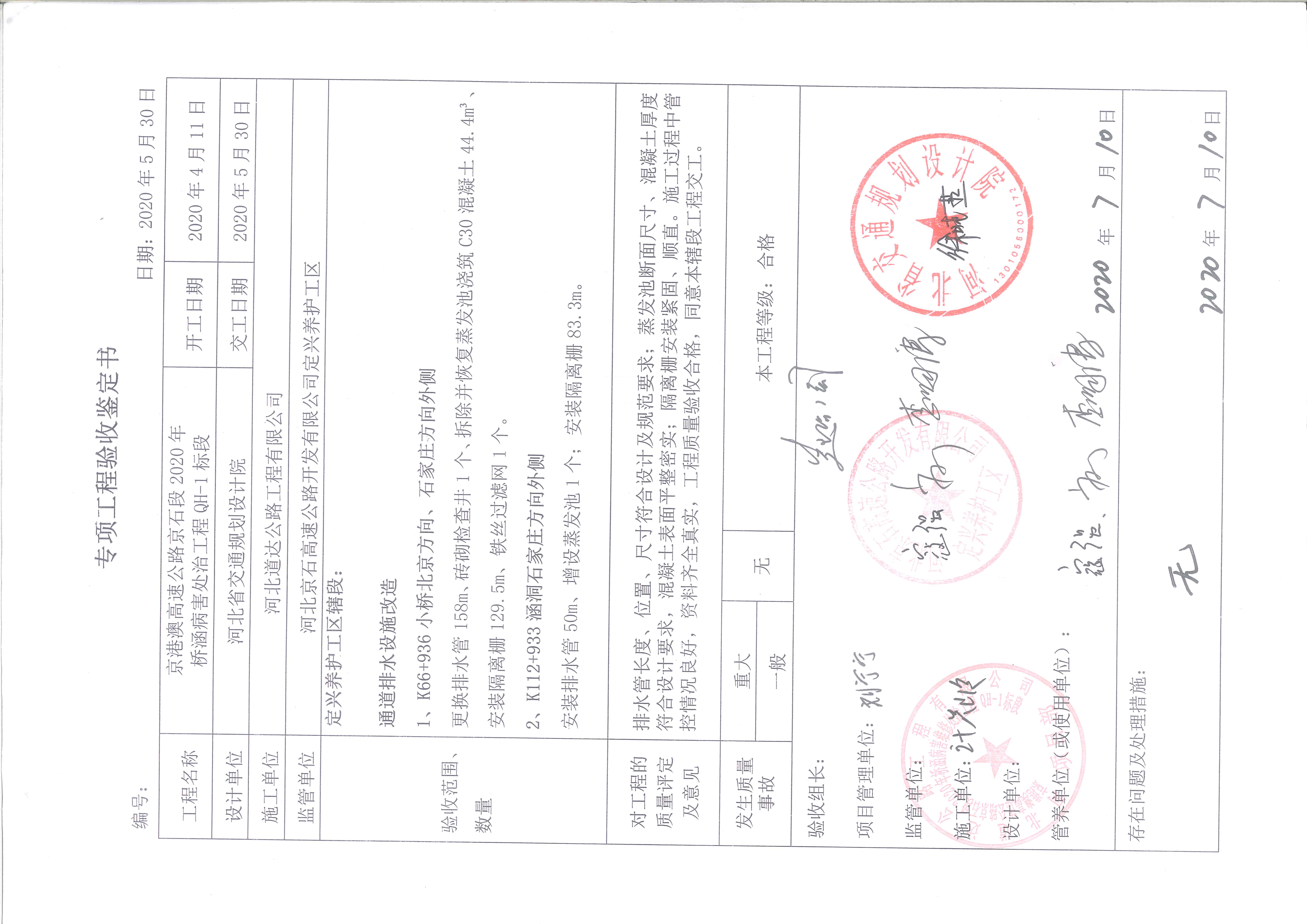 京港澳高速公路京石段2020年橋涵病害處治工程QH-1標段驗收證書