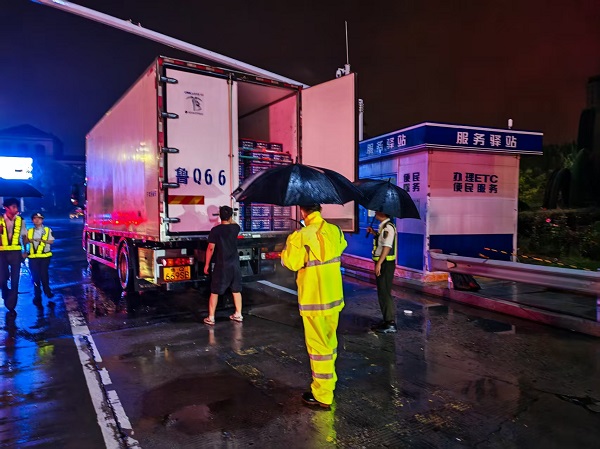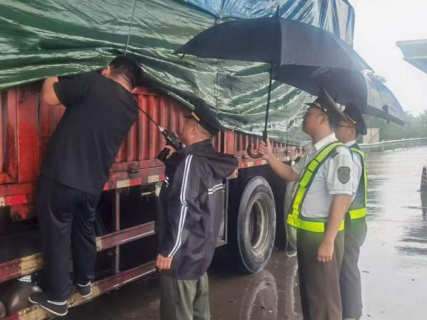 “綠通車輛車身重,雨天路滑易打滑,大家引導(dǎo)時(shí)務(wù)必站在安全區(qū)域,仔細(xì)核對(duì)證件和貨物信息!”突擊隊(duì)隊(duì)長(zhǎng)的喊話雖被雨聲切割成碎片,卻清晰地傳到每個(gè)隊(duì)員耳中。而此時(shí)正值綠通車輛通行高峰,新鮮蔬菜、水果等物資運(yùn)輸車源源不斷駛來(lái)。若因暴雨導(dǎo)致查驗(yàn)效率下降,不僅會(huì)造成車道擁堵,更可能讓鮮活物資因延誤受損。突擊隊(duì)隊(duì)長(zhǎng)一聲令下,幾名黨員迅速集結(jié),攜帶查驗(yàn)工具、防滑墊、警示錐等物資,沖向雨勢(shì)最猛的收費(fèi)廣場(chǎng)。
