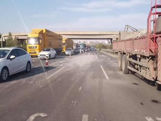 5月1日凌晨5點(diǎn),第二養(yǎng)護(hù)工區(qū)接智調(diào)中心通知,北京方向146路段發(fā)生貨車側(cè)翻事故,貨物散落導(dǎo)致三車道堵塞,正值“五一”假期首日,交通疏導(dǎo)壓力驟增。