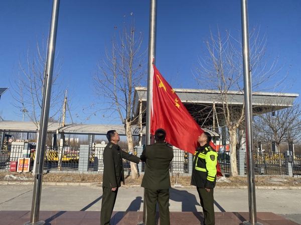 8時整,升旗儀式正式開始。英姿颯爽的護旗手邁著矯健有力的步伐護送國旗入場。他們身姿挺拔,每一步都踏得堅實有力,仿佛踏出的是對祖國深深的熱愛與敬意。飄揚的五星紅旗,寄托著對祖國繁榮昌盛的美好祈愿,也承載著高碑店收費站全體工作人員在新一年的奮斗目標。